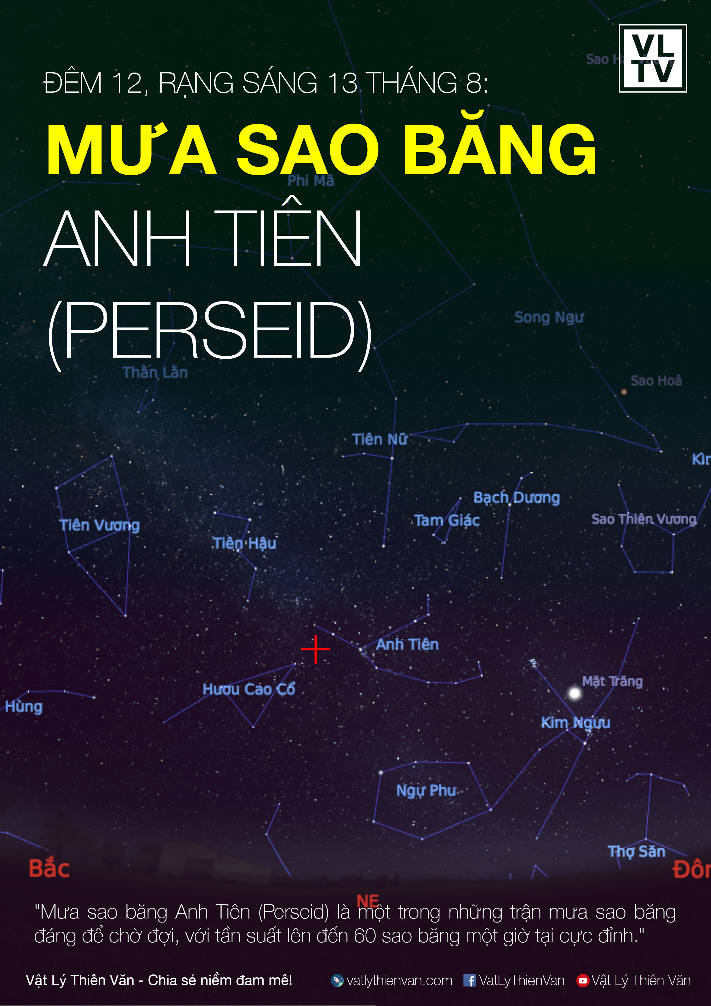 Trận mưa sao băng diễn ra hằng năm từ ngày 17 tháng 7 đến ngày 24 tháng 8. Cực điểm năm nay của Anh Tiên rơi vào đêm 12, rạng sáng 13 tháng 08.
