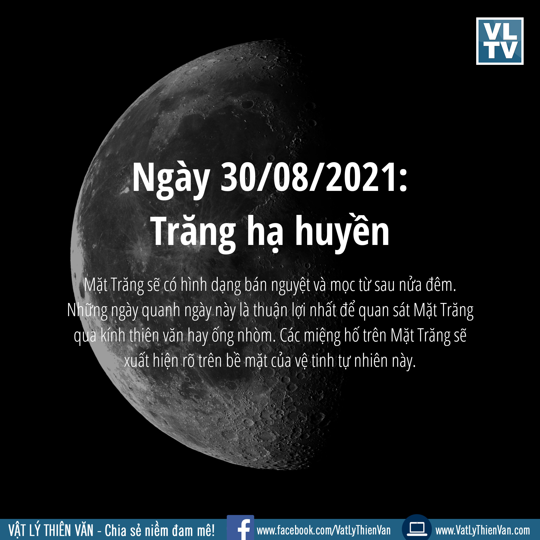 Mặt Trăng sẽ có hình dạng bán nguyệt và mọc từ sau nửa đêm. Những ngày quanh ngày này là thuận lợi nhất để quan sát Mặt Trăng qua kính thiên văn hay ống nhòm. Các miệng hố trên Mặt Trăng sẽ xuất hiện rõ trên bề mặt của vệ tinh tự nhiên này.
