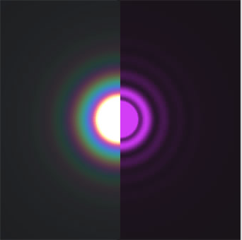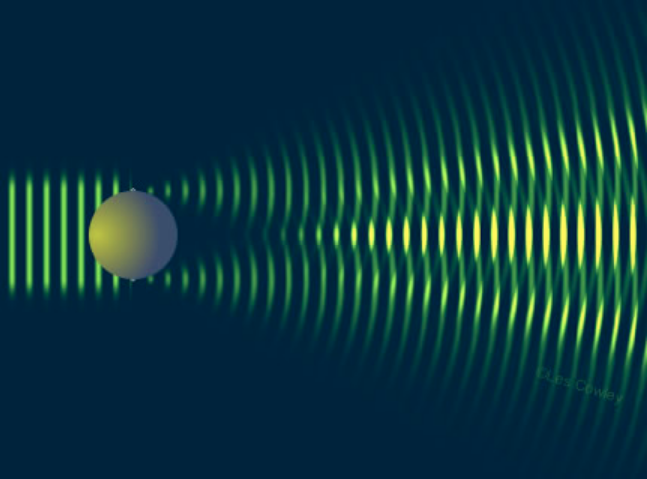 Hình 3. Hình ảnh minh hoạ cách mà hai điểm trên bề mặt một giọt nhỏ có thể tán xạ ánh sáng và biểu hiện như các nguồn của sóng cầu. Các sóng tán xạ chồng lên nhau và giao thoa. Nơi có các gợn sóng cùng chiều biên độ gặp nhau thì cường độ ánh sáng tăng lên. Nơi các sóng có biên độ đối nhau thì triệt tiêu. Ánh sáng tán xạ từ toàn bộ bề mặt giọt nhỏ và các sóng lan truyền kết hợp để tạo thành một hình ảnh nhiễu xạ - một quang hoa. Credit: atoptics.co.uk