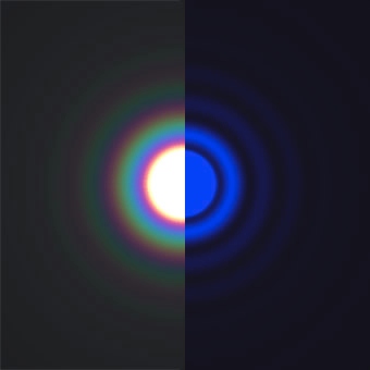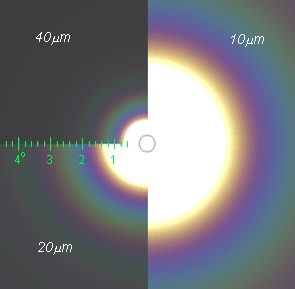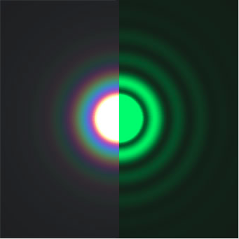 Hình 4. Quang hoa trắng và quang hoa ở các phổ màu đơn lẻ với kích thước khác nhau tuỳ thuộc vào bước sóng.