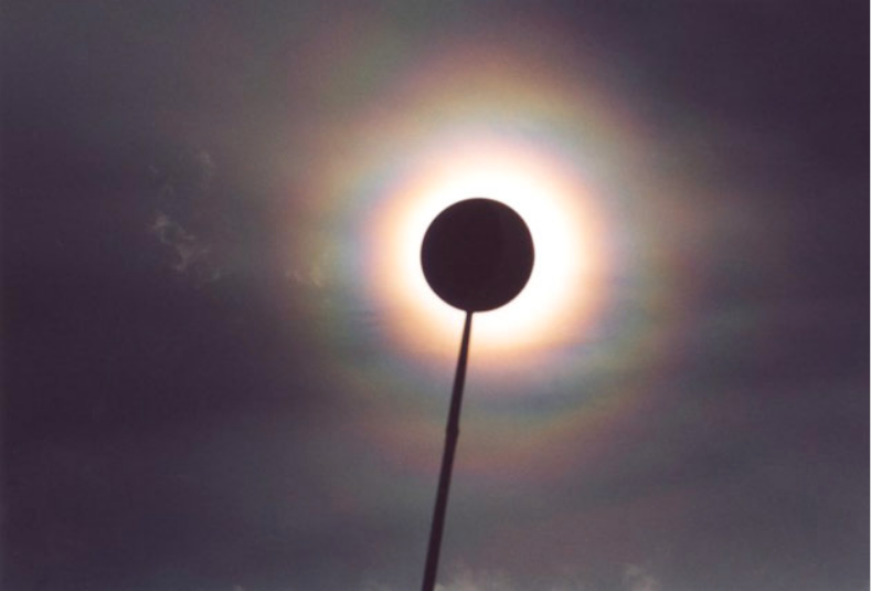 Hình 1. Quang hoa bao quanh Mặt Trời. Đĩa sáng bị che một phần ở giữa bao quanh bởi viền đỏ là vầng hào quang. Có hai vòng sáng bao quanh vầng hào quang này.
