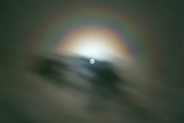 Hình 2. Bức ảnh chụp cho thấy đĩa Mặt Trăng đã được giảm sáng nhờ mây che, và quầng sáng nhiều màu sắc bao quanh Mặt Trăng. Credit: ©2004 Eva Seidenfaden, atoptics.co.uk.