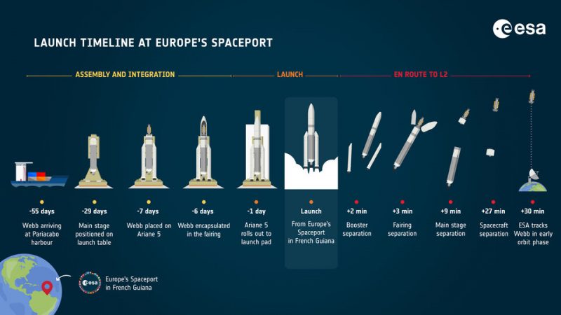 Cơ quan vũ trụ Châu Âu cho biết hôm 12 tháng 10 rằng James Webb - kế nhiệm của Hubble đã cập bến an toàn đến đảo Guiana Pháp. ESA cho biết hiện họ đang phối hợp với NASA để chuẩn bị cho cái gọi là sứ mệnh “một lần trong đời” cho vụ phóng của Webb bằng tên lửa Ariane 5 từ cảng vũ trụ của Châu Âu. Các nhóm xử lý kiểm tra và nạp nhiên liệu vào các thùng chứa của tàu vũ trụ, sau đó các đội kỹ thuật sẽ ghép nối Webb với các bệ phóng của nó.