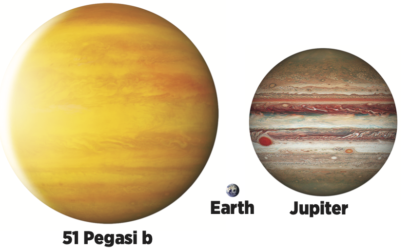 Mô phỏng kích thước 51 Pegasi b, đươc phát hiện vào năm 1995 qua phương pháp Quá cảnh, phát hiện này được trao giải Nobel vào năm 2019.