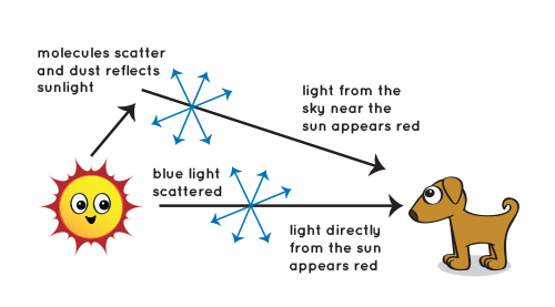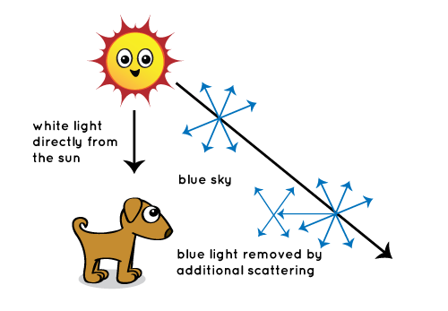 Khi Mặt Trời xuống thấp hơn trên bầu trời, ánh sáng của nó sẽ đi qua nhiều bầu khí quyển hơn để đến với bạn. Thậm chí nhiều ánh sáng xanh bị tán xạ, cho phép các màu đỏ và vàng đi thẳng vào mắt bạn.