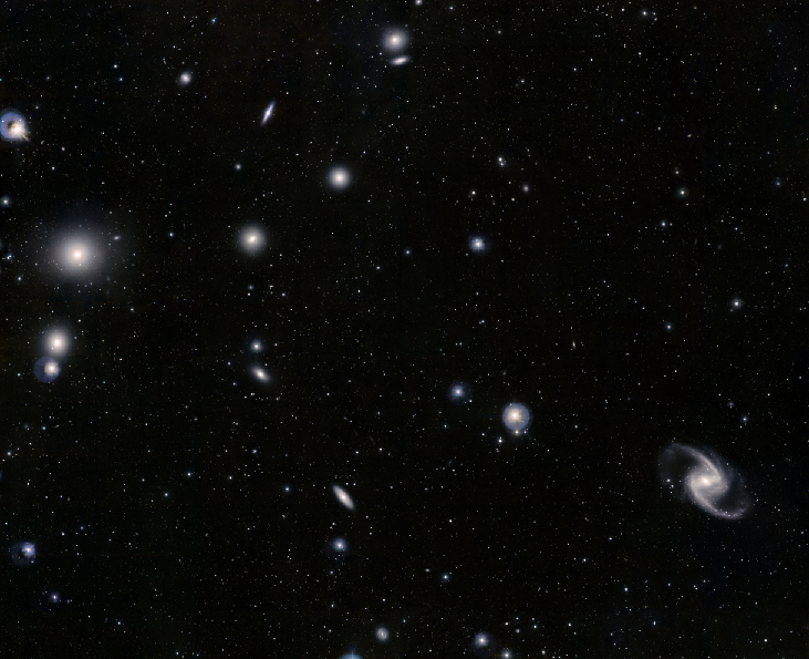 Hình 1.14 Cụm thiên hà Fornax. Trong hình ảnh này, bạn có thể nhìn thấy một phần của cụm thiên hà nằm cách chúng ta khoảng 60 triệu năm ánh sáng trong chòm sao Fornax (Thiên Lô). Tất cả các vật thể không-phải-là-các-chấm-sáng trong bức ảnh đều là thiên hà chứa hàng tỷ ngôi sao. (tín dụng: ESO, J. Emerson, VISTA. Lời cảm ơn: Đơn vị Khảo sát Thiên văn Cambridge)