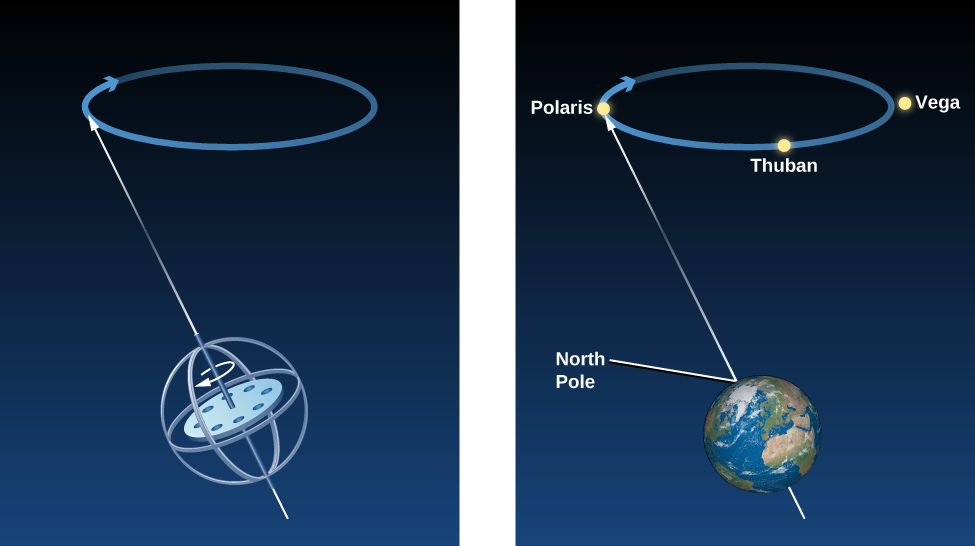 Hình 2.12. Tiến động. Cũng tương tự như đỉnh trục của một con quay nhanh lắc lư theo một vòng tròn, trục của Trái Đất cũng dao động lắc lư theo chu kỳ 26.000 năm. Ngày nay, thiên cực bắc nằm gần sao Polaris, nhưng khoảng 5000 năm trước nó ở gần một ngôi sao tên là Thuban, và trong 14.000 năm nữa, nó sẽ ở gần ngôi sao Chức Nữ nhất.