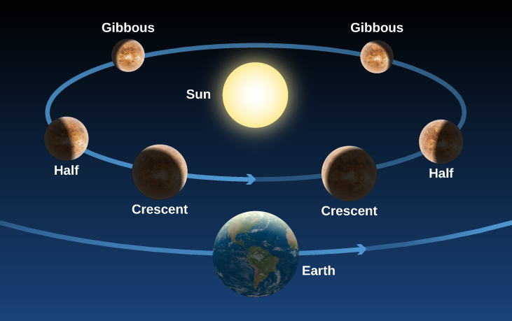 Hình 2.18 Các pha của Sao Kim. Khi Sao Kim di chuyển xung quanh Mặt Trời, chúng ta thấy sự chiếu sáng thay đổi trên bề mặt của nó, cũng giống như chúng ta thấy mặt của Mặt Trăng được chiếu sáng khác nhau trong tiến trình một tháng.