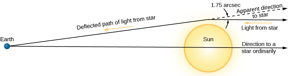 Thử nghiệm thứ hai của Einstein là thứ chưa từng được quan sát trước đây và do đó sẽ cung cấp một xác nhận tuyệt vời cho lý thuyết của ông. Vì không thời gian cong hơn ở những vùng có trường hấp dẫn mạnh, nên chúng ta mong đợi ánh sáng đi qua rất gần Mặt Trời sẽ xuất hiện theo một đường cong (Hình 24.10), giống như của con kiến trong trường hợp tương tự của chúng ta. Einstein đã tính toán từ thuyết tương đối tổng quát rằng ánh sáng ngôi sao lướt qua bề mặt Mặt Trời sẽ bị lệch đi một góc 1,75 arcsec. Có thể quan sát thấy sự lệch hướng như vậy không?