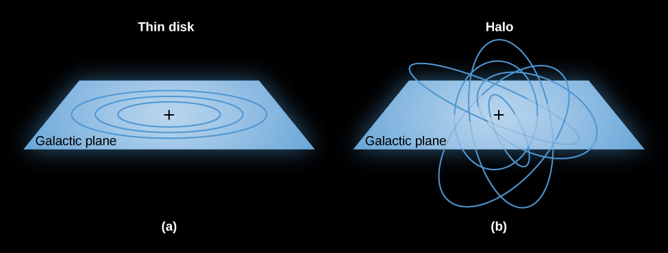 Hình 25.19 Cách Vật thể quay quanh Thiên hà. (a) Trong hình ảnh này, bạn nhìn thấy các ngôi sao trong đĩa mỏng của Thiên hà của chúng ta theo quỹ đạo gần tròn. (b) Trong hình ảnh này, bạn thấy chuyển động của các ngôi sao trong tán hào quang của Thiên hà theo các quỹ đạo hình elip và được định hướng ngẫu nhiên.