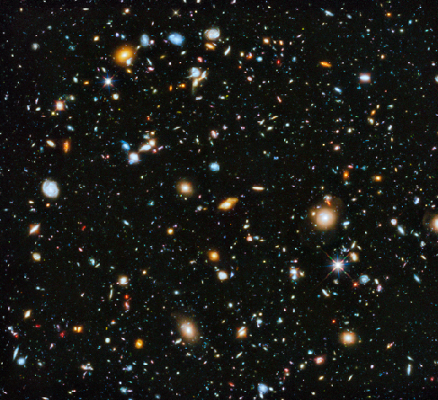 Hình 28.4 Trường siêu sâu của Hubble. Hình ảnh này là kết quả của một cuộc quan sát kéo dài 11 ngày bằng Kính viễn vọng Không gian Hubble về một vùng nhỏ trên bầu trời, nằm về phía chòm sao Thiên Lô (Fornax) gần cực nam. Đây là khu vực chỉ có một số ít các ngôi sao của Ngân Hà. (Kể từ khi Hubble quay quanh Trái Đất cứ 96 phút một lần, kính thiên văn quay lại quan sát cùng một mảnh bầu trời nhỏ bé lặp đi lặp lại cho đến khi thu thập đủ ánh sáng và cộng lại với nhau để tạo ra ảnh phơi sáng rất lâu này.) Có khoảng 10.000 vật thể trong hình ảnh duy nhất này, gần như tất cả chúng là các thiên hà, mỗi thiên hà có hàng chục hoặc hàng trăm tỷ ngôi sao. Chúng ta có thể thấy một số thiên hà xoắn ốc hình chong chóng, giống như Ngân Hà. Nhưng chúng ta cũng tìm thấy rất nhiều thiên hà có hình dạng kỳ dị đang va chạm với các thiên hà đồng hành. Các thiên hà elip, chủ yếu chứa các ngôi sao già, xuất hiện dưới dạng đốm màu đỏ. (ảnh: sửa đổi công việc của NASA, ESA, H. Teplitz và M. Rafelski (IPAC / Caltech), A. Koekemoer (STScI), R. Windhorst (Đại học bang Arizona) và Z. Levay (STScI))