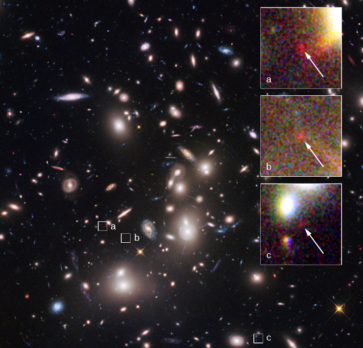 Hình 28.6 Một trong những thiên hà xa nhất, mờ nhất và nhỏ nhất từng thấy. Các hộp nhỏ màu trắng, có nhãn a, b và c, đánh dấu vị trí ba ảnh của cùng một thiên hà. Nhiều ảnh này được tạo ra bởi cụm thiên hà khổng lồ được gọi là Abell 2744, nằm ở giữa chúng ta với thiên hà này và hoạt động như một thấu kính hấp dẫn. Các mũi tên trong phần được phóng to phía bên phải khung hình chỉ vị trí thiên hà này. Mỗi hình ảnh phóng đại làm cho thiên hà có vẻ lớn hơn và sáng hơn gấp 10 lần so với hình ảnh nguyên gốc nếu không có thấu kính hấp dẫn can thiệp. Thiên hà này phát ra ánh sáng mà chúng ta quan sát được ngày nay khi vũ trụ chỉ mới khoảng 500 triệu năm tuổi. Khi ánh sáng được phát ra, thiên hà rất nhỏ - chỉ có bề ngang 850 năm ánh sáng, hay nhỏ hơn 500 lần so với Ngân Hà, và khối lượng của nó chỉ bằng 40 triệu lần khối lượng của Mặt Trời. Sự hình thành sao đang diễn ra trong thiên hà này, nhưng nó xuất hiện màu đỏ trong ảnh do độ dịch chuyển đỏ lớn của nó. (ảnh: sửa đổi công việc của NASA, ESA, A. Zitrin (Viện Công nghệ California) và J. Lotz, M. Mountain, A. Koekemoer, và Nhóm HFF (STScI))