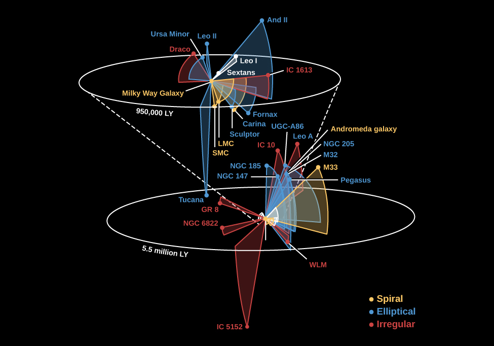 Khu vực vũ trụ mà chúng ta có thông tin chi tiết nhất là vùng lân cận địa phương của chúng ta. Hóa ra Thiên hà Ngân Hà là một thành viên của một nhóm nhỏ các thiên hà được gọi là Nhóm Địa phương. Nó trải rộng trong khoảng 3 triệu năm ánh sáng và chứa khoảng 60 thành viên. Có ba thiên hà xoắn ốc lớn (thiên hà của chúng ta, Tiên Nữ và M33), hai thiên hà elip trung bình, và nhiều thiên hà lùn và thiên hà vô định hình khác.