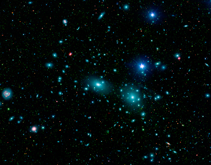 Hình 28.16 Khu vực trung tâm của Cụm thiên hà Coma. Hình ảnh kết hợp giữa ánh sáng nhìn thấy (từ Khảo sát Bầu trời Kỹ thuật số Sloan) và hồng ngoại (từ Kính viễn vọng Không gian Spitzer) đã được mã hóa màu để các thiên hà lùn mờ có màu xanh lục. Lưu ý số lượng các vết màu xanh lá cây nhỏ trong hình. Cụm sao này cách chúng ta khoảng 320 triệu năm ánh sáng. (ảnh: sửa đổi công việc của NASA / JPL-Caltech / L. Jenkins (GSFC))