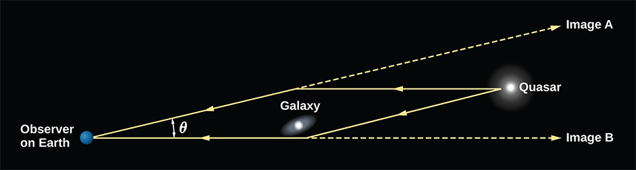 Bây giờ, chúng ta hãy xem xét trường hợp ánh sáng từ một thiên hà xa xôi hoặc chuẩn tinh đi qua gần nơi tập trung vật chất, chẳng hạn như một cụm thiên hà, trong hành trình tới kính thiên văn của chúng ta. Theo thuyết tương đối rộng, đường đi của ánh sáng có thể bị bẻ cong theo nhiều cách khác nhau; kết quả là chúng ta có thể quan sát hình ảnh bị méo và thậm chí là có nhiều hình ảnh như vậy (Hình 28.17).