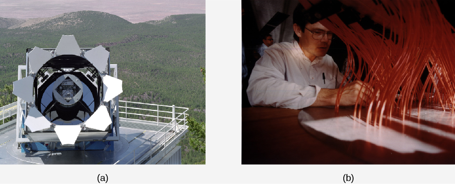 Hình 28.22 Khảo sát Bầu trời Kỹ thuật số Sloan. (a) Kính viễn vọng Khảo sát Bầu trời Kỹ thuật số Sloan được nhìn thấy ở đây đứng trước Dãy núi Sacramento ở New Mexico. (b) Nhà thiên văn học Richard Kron chèn một số sợi quang học vào tấm khoan sẵn để cho phép các thiết bị tạo ra nhiều quang phổ của các thiên hà cùng một lúc. (ảnh a, b: sửa đổi công việc của Khảo sát Bầu trời Kỹ thuật số Sloan)Khoảng một giờ là đủ cho mỗi bộ quang phổ và các tấm nhôm được khoan trước có thể được chuyển đổi nhanh chóng. Do đó, có thể chụp tới 5000 quang phổ trong một đêm (miễn là thời tiết đủ tốt).