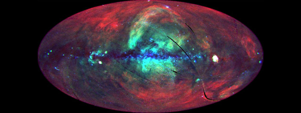 Hình 5.7 Bầu trời tia X. Đây là bản đồ bầu trời được điều chỉnh theo một số loại tia X nhất định (nhìn từ phía trên bầu khí quyển của Trái Đất). Bản đồ làm nghiêng bầu trời để cho đĩa Thiên hà Ngân Hà của chúng ta chạy ngang qua tâm của nó. Bản đồ được xây dựng và tô màu nhân tạo từ dữ liệu do vệ tinh ROSAT của Châu u thu thập. Mỗi màu (đỏ, vàng và xanh lam) cho thấy tia X có tần số hoặc năng lượng khác nhau. Ví dụ, màu đỏ phác họa ánh sáng từ một bong bóng khí nóng cục bộ xung quanh chúng ta, được thổi bởi một hoặc nhiều ngôi sao đang nổ trong vùng vũ trụ lân cận của chúng ta. Màu vàng và xanh lam cho thấy các nguồn tia X ở xa hơn, chẳng hạn như tàn dư của các ngôi sao đã phát nổ khác hoặc trung tâm hoạt động của Thiên hà của chúng ta (ở giữa hình ảnh). (tín dụng: sửa đổi công việc của NASA)