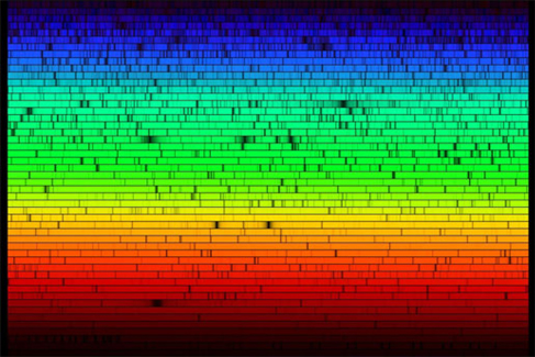 Hình 5.11 Quang phổ nhìn thấy của Mặt Trời. Ngôi sao của chúng ta có quang phổ bị cắt ngang bởi các vạch tối được tạo ra bởi các nguyên tử trong khí quyển Mặt Trời hấp thụ ánh sáng ở các bước sóng nhất định. (tín dụng: sửa đổi công việc của Nigel Sharp, NOAO / Đài quan sát Mặt trời Quốc gia tại Đỉnh Kitt / AURA, và Quỹ Khoa học Quốc gia)