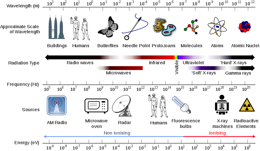 Sóng vô tuyến có bước sóng dài nhất và chứa nguồn năng lượng thấp nhất trong số bất kì sóng điện từ nào. Trong khi ánh sáng nhìn thấy đo được chưa tới 1 inch thì sóng vô tuyến lại dao động từ 19cm - khoảng chiều dài của một chai nước tới những sóng có chiều dài như chiếc xe hơi, tàu và cả những ngọn núi, những sóng vô tuyến khổng lồ còn dài hơn cả đường kính hành tinh của chúng ta.