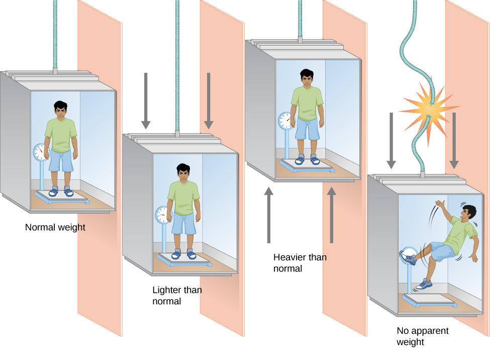 Hình 24.3 Trọng lượng của bạn trong thang máy. Trong thang máy khi đứng yên, bạn cảm thấy trọng lượng bình thường của mình. Trong thang máy tăng tốc khi đi xuống, bạn sẽ cảm thấy nhẹ hơn bình thường. Trong thang máy tăng tốc khi đi lên, bạn sẽ cảm thấy nặng hơn bình thường. Nếu một kẻ thủ ác cắt dây cáp thang máy, bạn sẽ cảm thấy không trọng lượng khi bạn đang rơi xuống.
