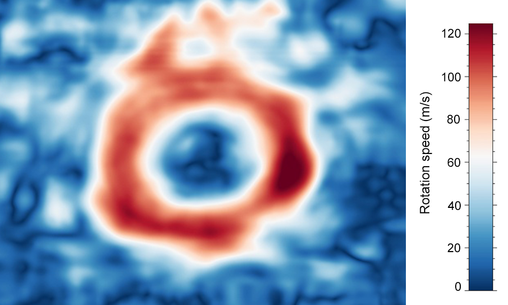 Ngược lại, những cơn gió gần vùng trong cùng của cơn bão, được minh họa bởi một vòng màu xanh lá cây nhỏ hơn, đang di chuyển chậm hơn đáng kể. Cả hai đều chuyển động ngược chiều kim đồng hồ.