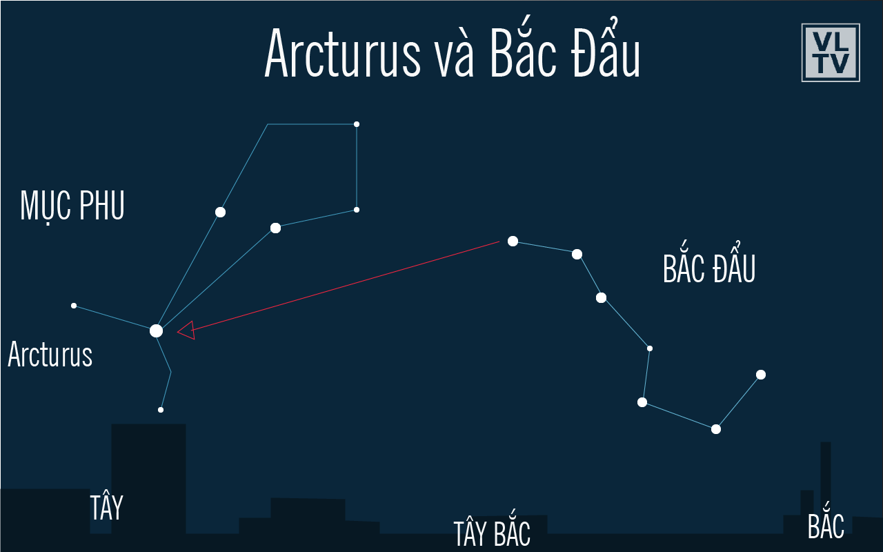 Ảnh: Cách tìm ra Arcturus thông qua tay cầm của Bắc Đẩu. Credit Nhung Nguyen VLTV