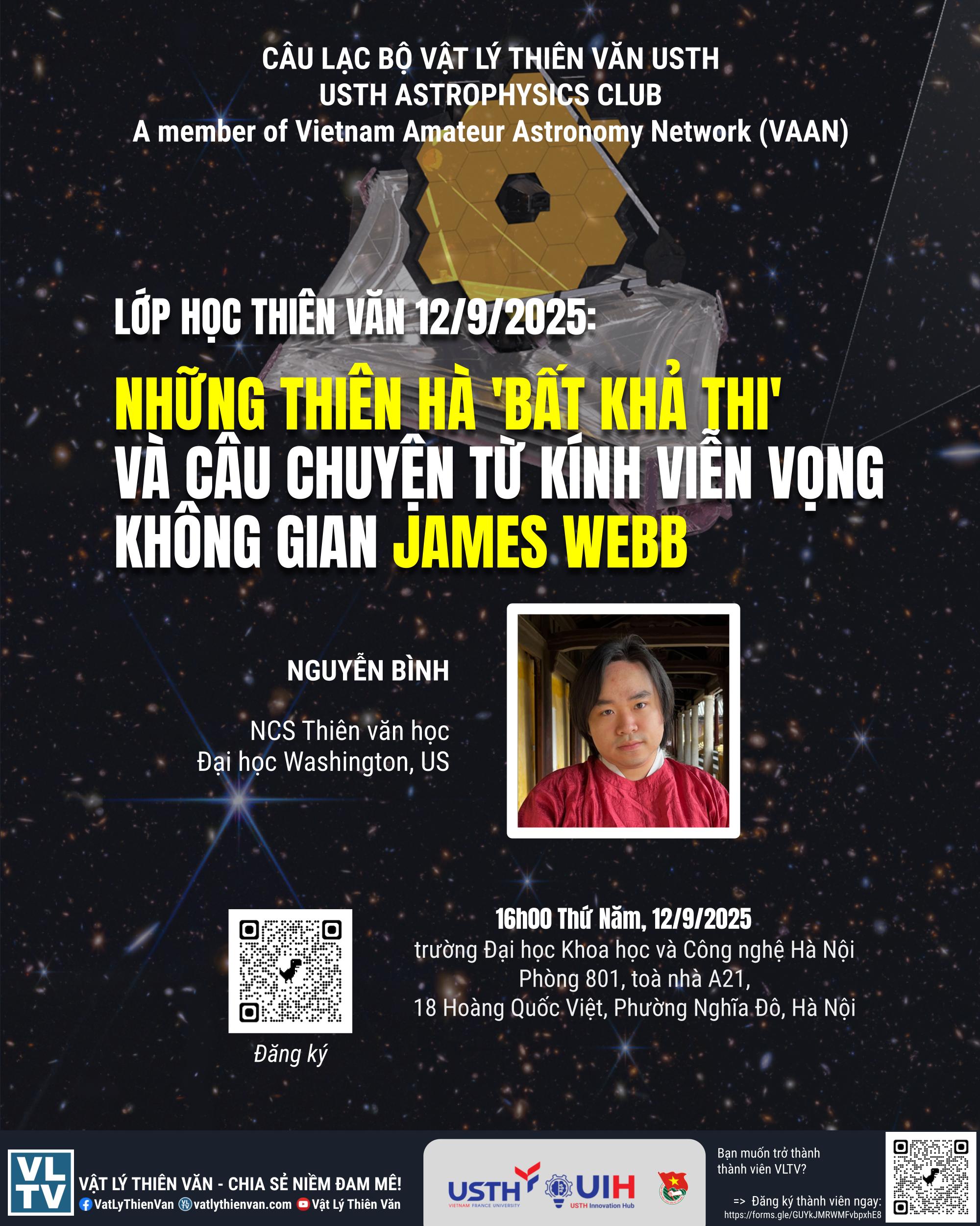 Câu lạc bộ Vật Lý Thiên Văn USTH (VLTV) thuộc Trường Đại học Khoa học và Công nghệ Hà Nội (USTH) trân trọng thông báo sẽ tổ chức sự kiện "Lớp học thiên văn" với chủ đề "Những thiên hà 'bất khả thi' và câu chuyện từ kính viễn vọng không gian James Webb". Buổi nói chuyện sẽ diễn ra vào lúc 16:00, Thứ Sáu, ngày 12 tháng 09 năm 2025 tại Hội trường 801, USTH, 18 Hoàng Quốc Việt, Cầu Giấy, Hà Nội.