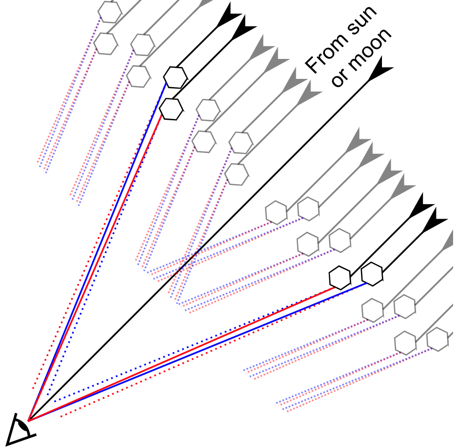 Hình 3. Hình vẽ minh họa chỉ rõ các tia sáng và tinh thể băng đã tạo ra vòng sáng như thế nào. Credit: Wikimedia.