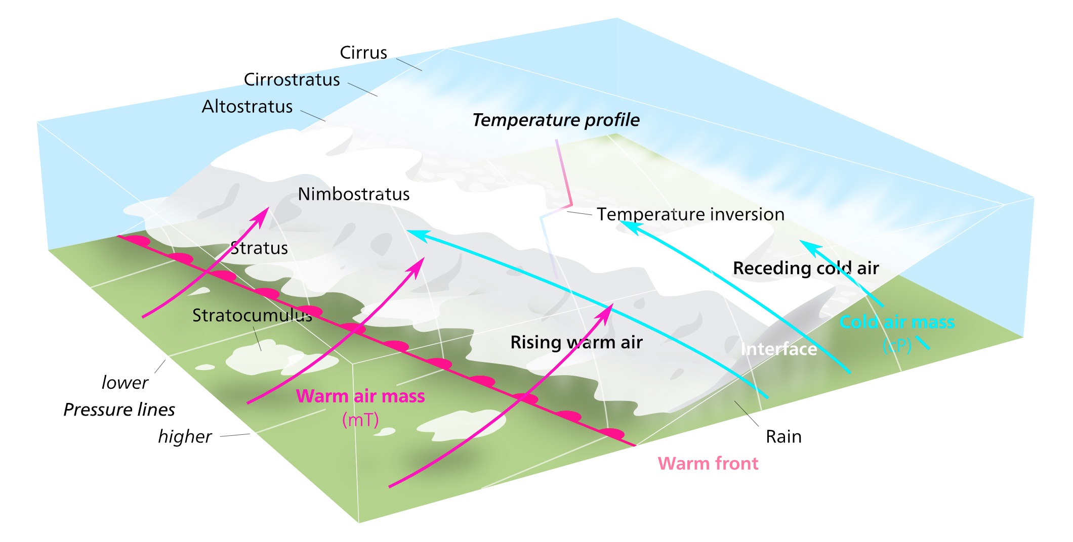 Hình 4. Hình vẽ mô tả sự hình thành của mây Ti tầng Cirrostratus (Cs), nguyên nhân làm xuất hiện Tán Trăng, khi có một frông ấm đang đến gần. Credit: Wikimedia.
