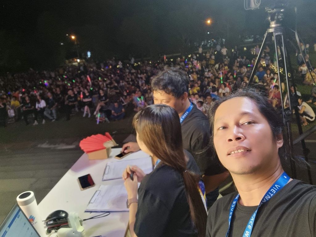 Hình 5 & 6. MC Moon và MC Phạm Vũ Lộc trong buổi tập dượt chuẩn bị và tại bàn kỹ thuật trong chương trình quan sát thiên văn Starry Night.