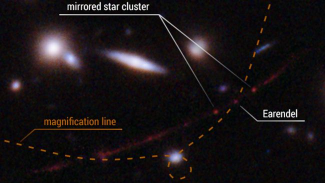 Bằng một cách hiếm hoi mà Earendel thẳng hàng với WHL0137-08, có nghĩa là ngôi sao xuất hiện trực tiếp hoặc cực kỳ gần, một đường cong trong không thời gian cung cấp độ sáng tối đa, khiến Earendel nổi bật so với ánh sáng chung của thiên hà quê hương của nó. Hiệu ứng này tương tự như bề mặt gợn sóng của bể bơi tạo ra các mô hình ánh sáng rực rỡ dưới đáy bể bơi vào một ngày nắng - các gợn sóng trên bề mặt hoạt động như thấu kính và tập trung ánh sáng Mặt Trời đến độ sáng tối đa trên sàn bể bơi.