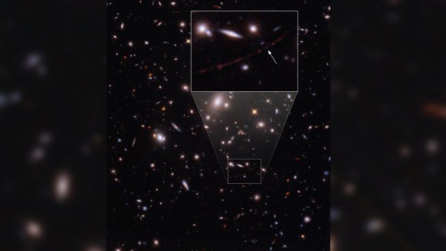 Ngôi sao xa nhất từng được nhìn thấy, được gọi là Earendel, được biểu thị bằng một mũi tên ở phía trong của hình ảnh này từ Kính viễn vọng Không gian Hubble đã chụp được ngôi sao cách 12,9 tỷ năm ánh sáng bằng thấu kính hấp dẫn.(Tín dụng hình ảnh: NASA, ESA, B. Welch (JHU), D. Coe (STScI), A. Pagan (STScI))