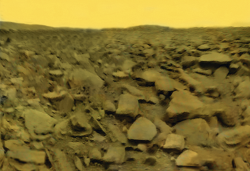 Phiên bản màu của hình ảnh đầu tiên từ bề mặt Sao Kim do tàu vũ trụ Venera 9 của Liên Xô chụp năm 1975. Venera 9/ Ted Styrk