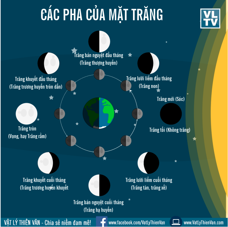 - Trăng tròn: còn gọi là trăng rằm, lúc này Trái Đất nằm ở giữa Mặt Trăng và Mặt Trời, có thể nhìn thấy cả đêm.